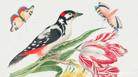 L'illustration du XVIIIe siècle d'un oiseau marbré noir et blanc sur une tige de tulipe avec des jonquilles et des papillons